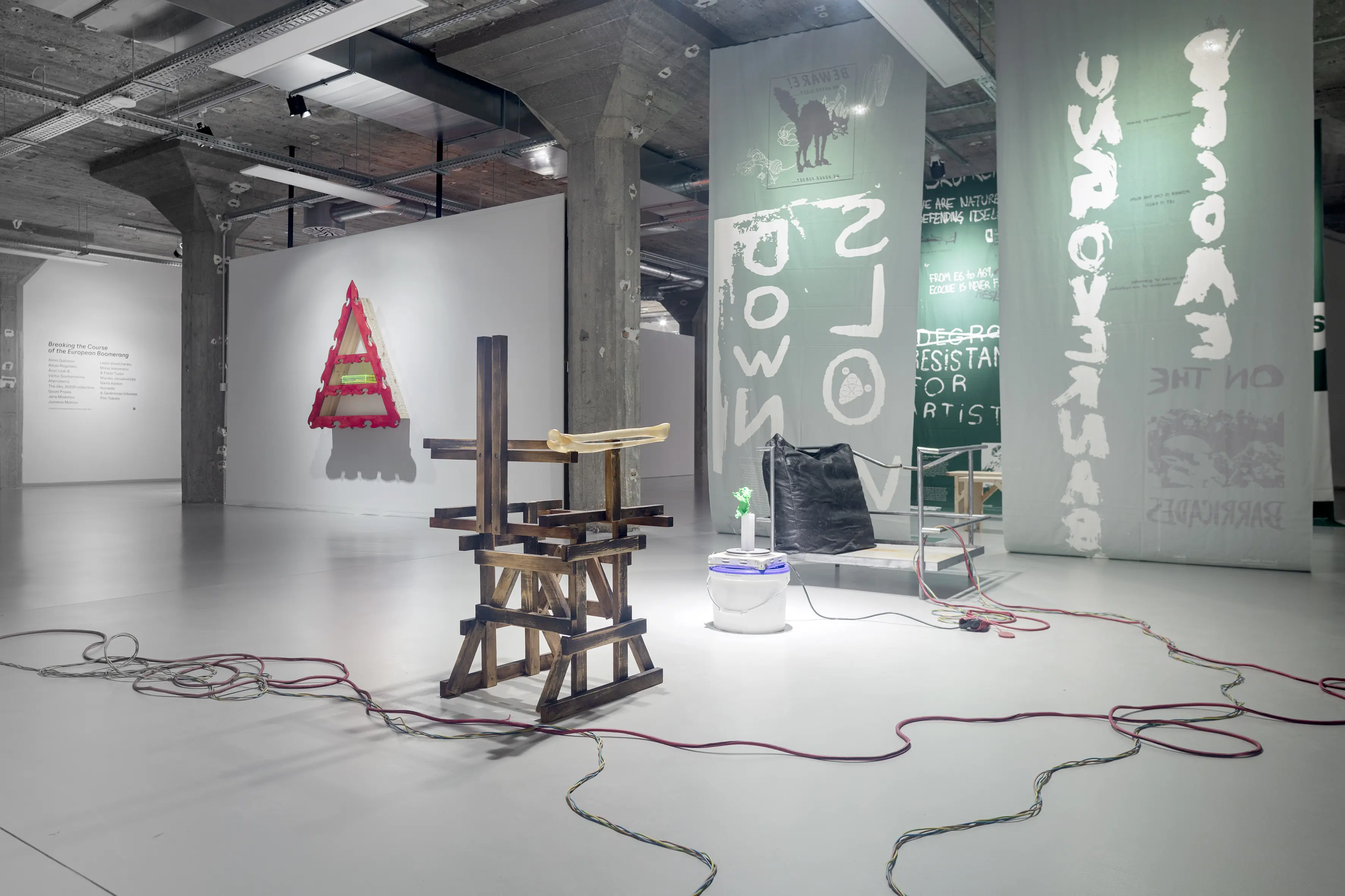 Funded by the complex social, economic, and structural challenges of global neoliberalism, Breaking the Course of the European Boomerang looks at how we can counteract the current rise in inequality within Europe without reverting to imperialism. Inspired by the historical solidarity between workers‘ unions across Europe and the world at large, the exhibition unfolds through various artistic actions developed by the artists involved who explore strategies and ideas relating to labor, education, and the use of social and natural resources.