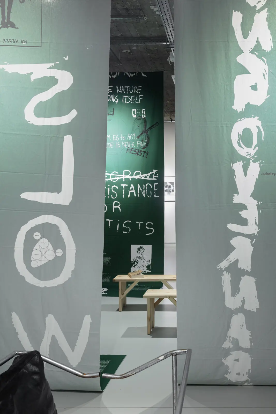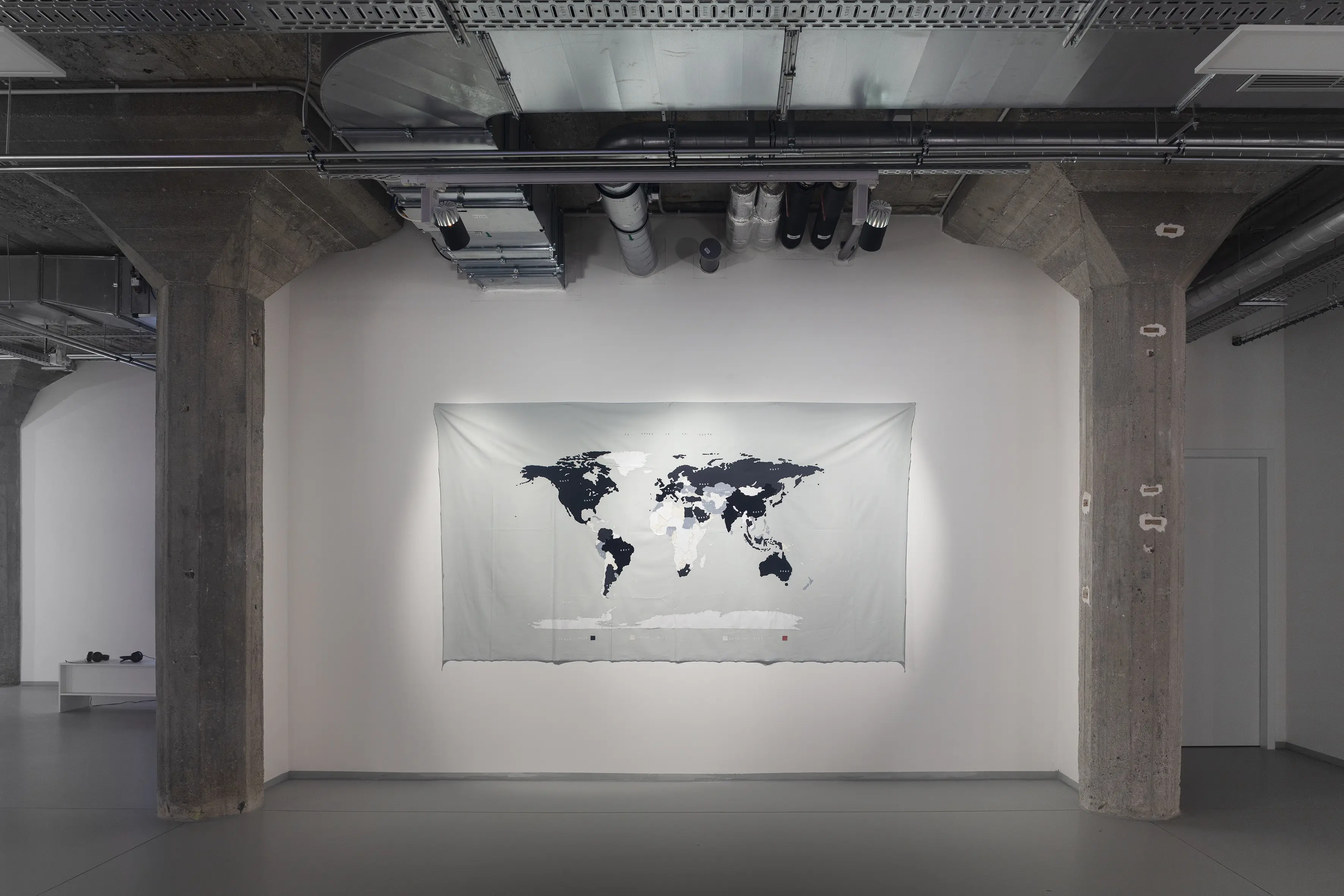 The different artistic positions in the exhibition explore how bodies, resources, and histories are caught in uneven systems of extraction, debt, and precarity. Mona Vatamanu & Florin Tudor set the stage with a hand-sewn map of world debt, exposing how prosperity is often built on speculation and hidden hierarchies of power. Nikita Kadan’s coal drawings, Jumana Manna’s tracing of displaced seeds, and Nomeda & Gediminas Urbonas’ parody of post-socialist privatization point to the ways war, agriculture, and ideology sustain unequal access to resources.